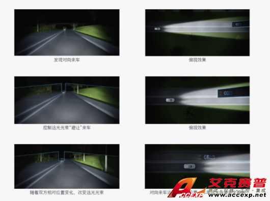 ♦  當駕駛視野中有其他道路使用者時(如跟車或會車時),LED-ADB 系統(tǒng)會自動捕捉其他道路使用者的位置,將相