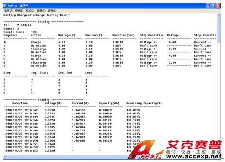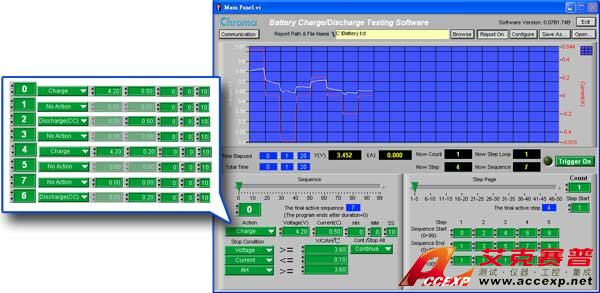 中茂 Chroma 電池測(cè)試及自動(dòng)化解決方案提供電池充放電測(cè)試軟件,整合直流電源及電子負(fù)載來(lái)進(jìn)行電池模塊測(cè)試,此系統(tǒng)可方便研發(fā)/品保測(cè)試電池的: a.容量測(cè)試(Capacity Test) b.放電性能測(cè)試(Discharge performance),在不同的放電率下得到C-V曲線 c.循環(huán)壽命測(cè)試 (Endurance in Cycles)。電池充放電測(cè)試軟件功能包括編輯測(cè)試順序,循環(huán)和停止條件,所測(cè)電壓 /電流 /電量將被記錄在一個(gè)文件中以便之后進(jìn)行分析。