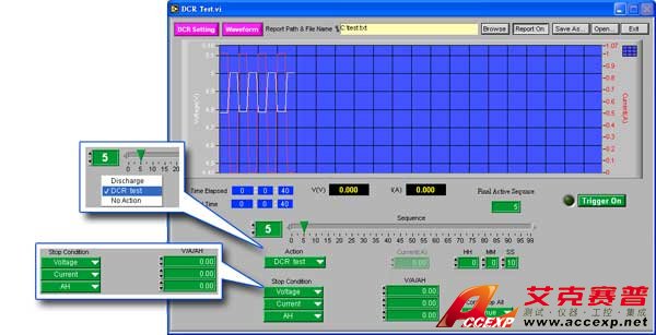 用戶可使用Battery DCR Measurement Software軟件,撘配Chroma 63600系列電子負(fù)載來(lái)測(cè)試。此軟件可設(shè)定量測(cè)直流阻抗的方式,并編輯放電程序,來(lái)自動(dòng)測(cè)試電池芯在不同電量(SOC)下的直流阻抗,并產(chǎn)生結(jié)果報(bào)表。