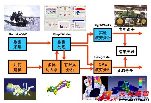 作為著名的疲勞耐久性技術(shù)服務(wù)公司之一的英國恩科(nCode)國際有限公司開發(fā)了一整套用于汽車耐久性設(shè)計(jì)、分析、試驗(yàn)及管理的硬件和軟件工具——ICE-flow系列產(chǎn)品。包括:數(shù)據(jù)采集器 Somat eDAQ、數(shù)據(jù)分析處理及實(shí)驗(yàn)疲勞軟件 GlyphWorks、CAE 疲勞分析軟件 DesignLife 和耐久性數(shù)據(jù)管理軟件系統(tǒng) Library。ICE-flow 集工程數(shù)據(jù)采集分析處理、疲勞壽命分析模擬、實(shí)驗(yàn)室臺架加速和遠(yuǎn)程數(shù)據(jù)傳遞及管理于一身,是進(jìn)行一體化抗疲勞設(shè)計(jì)必備的一個分析工具, 也是進(jìn)行異地協(xié)同設(shè)計(jì)的有效工具。 ICE-flow系列產(chǎn)品如圖 2所示,以下對各功能分別進(jìn)行介紹。