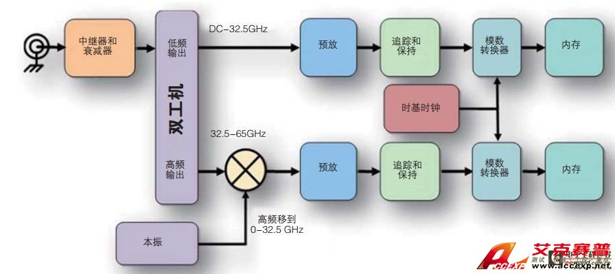 Martin詳細描述了之前的一些技術方案:“為了拓展帶寬,時間隔行掃描是一種常用技術。隨著采樣率的提高,隨機噪聲會均勻分布到新的內奎斯特帶寬上。泰克的競爭對手在高帶寬示波器上采用數字帶寬隔行掃描,對于示波器設計人員來說,其主要優(yōu)勢是每臺ADC的采樣率只需大于總帶寬。但是這種設計面臨許多挑戰(zhàn)。一旦采集結束,數據放入波形內存,那么必須使用DSP把上方頻段上變頻回到原始頻率范圍。恢復兩個‘一半’頻譜、重建波形非常復雜。由于路徑并不是完全一樣,因此必須在抵消中補償這些差異,抵消則是DSP的一部分。此外,由于兩個‘一半’頻譜中使用急劇的帶通濾波器,因此恢復頻譜的具體中心存在問題。在重復區(qū)域可能有平坦度問題,在該點上相位線性度也有問題。噪聲PSD會均勻分布在采樣通道的內奎斯特帶寬上。事實上,使用頻率交織時,噪聲會提高,而且沒有在保持帶寬不變的情況下去降低噪聲的機會。”