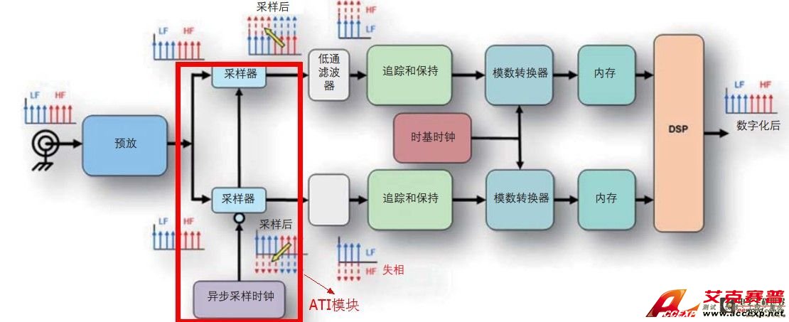 ATI中完全對稱的路徑實現(xiàn)理想的性能匹配;每條路徑數字化整個信號,而不只是一半;重建增加了兩份整個信號,可以除以2進行平均,使噪聲下降3dB。Martin對ATI的原理進行了細致的解釋:“在異步時序交織(ATI)技術中,預采樣器作為諧波混頻器。框圖如下圖所示。需要說明的是:路徑是對稱的,ATI中使用兩個ADC采樣整個頻譜,信號的整個帶寬都被應用到兩個ADC,這樣,噪聲的功率譜密度均勻分布到總采樣率中(每個ADC采樣率的2倍),結果,通帶中的整體噪聲要低于類似頻率交織結構中的噪聲。這種設計采用預采樣器,故意對輸入信號進行次采樣,從而產生假信號,或把頻譜成分的上半部分翻回到ADC的內奎斯特帶寬。在最后組合步驟中,本質上是和除以2,這一函數把輸入幅度返回原始值,另外會影響整個采集的噪聲平均,從而進一步降低測量通道的總噪聲。”