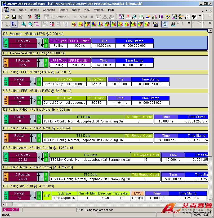 LeCroy力科 Voyager M3x USB協(xié)議分析儀前端采用了最新的Teledyne LeCroy探測(cè)技術(shù),可為USB 3.0記錄提供快速鎖定且毫不妥協(xié)的準(zhǔn)確性。SuperSpeed USB設(shè)備利用基于硬件的電源管理,使設(shè)備頻繁進(jìn)入電源掛起模式。當(dāng)處于聯(lián)機(jī)狀態(tài)時(shí),Voyager系統(tǒng)將檢測(cè)并無(wú)縫地從電氣空閑狀態(tài)恢復(fù),同時(shí)在顯示屏中準(zhǔn)確顯示帶有時(shí)間戳的所有總線和電源狀態(tài)轉(zhuǎn)換。