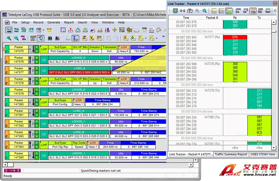 LeCroy力科 Voyager M3x USB協(xié)議分析儀的前端具有標(biāo)準(zhǔn)的USB 3.0連接器,該連接器支持USB 2.0和3.0信號(hào),可同時(shí)無(wú)損捕獲來(lái)自?xún)蓚€(gè)鏈路的流量。同時(shí)進(jìn)行高速和超高速記錄,可以端到端查看USB 3.0集線器上的數(shù)據(jù)傳輸。該系統(tǒng)可以作為USB 2.0 / 3.0分析儀運(yùn)行;并且僅在可升級(jí)到3.0的僅2.0的配置中可用。