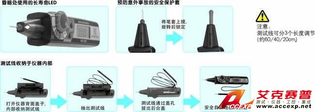 內置式試電筆功能,無需攜帶其他工具就能檢測現(xiàn)場 交直流電壓的存在位置。 (此時,量程600V/分辨率0.01基礎準確度1%±5) 從基本電壓測試到排察靈敏電子電路故障的各種應用 或測試需求。  |