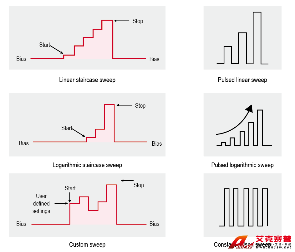 IT2805 SMU具備標(biāo)準(zhǔn)和列表LIST掃描功能。標(biāo)準(zhǔn)SWEEP模式下,支持線性和對(duì)數(shù)模式,單次和雙次掃描功能以及恒定和脈沖掃描功能。列表LIST掃描功能可以有效地執(zhí)行任意波形輸出,在表征響應(yīng)隨應(yīng)用電壓或電流而變化的測(cè)試中非常有用,用戶可以使用Excel導(dǎo)入或面板編輯的方式,生成一個(gè)任意形狀的掃描曲線,最多可以導(dǎo)入99999點(diǎn)數(shù)據(jù),是U-I和I-U特性測(cè)試的理想選擇。