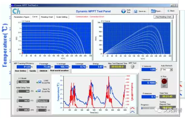 2. 軟件將記錄檔案讀入,設(shè)定太陽(yáng)能電池特性及面積,即可仿真出變動(dòng)的特性曲線。