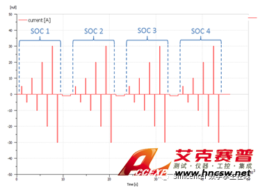 在做擬合之前,建議輸入Amesim軟件中推薦的下圖電流數(shù)據(jù)。分別作某一溫度下(比如25攝氏度),不同恒定SOC1、SOC2、SOC3、SOC4等的短時(shí)不同倍率電流下的充放電試驗(yàn)。
