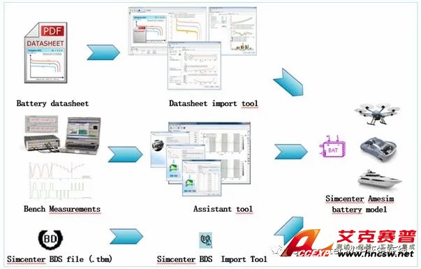 Amesim軟件中為了降低軟件建模的使用難度,提供了電池建模的多個(gè)可視化的自動(dòng)化建模工具,如電池?cái)?shù)表導(dǎo)入工具,特別是根據(jù)電池HPPC提供的電流和電壓數(shù)據(jù)自動(dòng)快速的識(shí)別電池的OCV、內(nèi)阻和極化等參數(shù),完成電池模型模型,用于進(jìn)一步的熱管理、整車等系統(tǒng)集成分析;另外,專門開發(fā)了Simcenter BDS的數(shù)據(jù)導(dǎo)入工具: