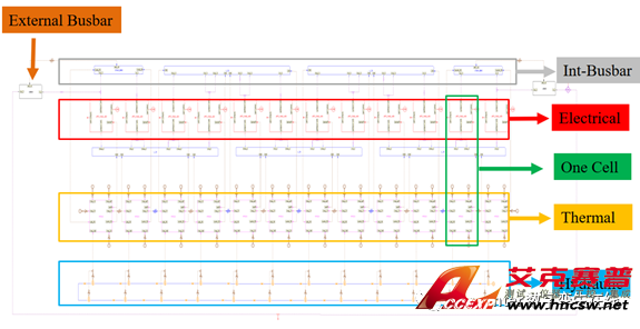 將離散的單體熱容模型,和電池的電模型、液冷板模型集成,再將單體模型進(jìn)一步的集成為電池模組熱管理模型: