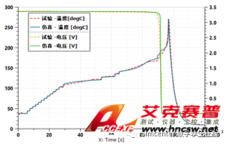 Amesim中能夠根據(jù)電池用ARC對(duì)熱失控進(jìn)行絕熱的熱失控實(shí)驗(yàn)數(shù)據(jù)來分析電池的熱失控過程,標(biāo)定電池?zé)崾Э剡^程中的溫度變化和電壓變化。