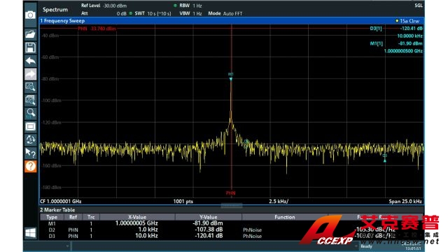R&S FPL1000 可與高級別分析儀相提并論,它在 10 kHz 偏置(1 GHz 載波)時的相位噪聲典型值為 –108 dBc (1 Hz),三階互調(diào)截取點典型值為 +20 dBm,分辨率帶寬為 1 Hz 至 10 MHz,顯示平均噪聲電平典型值為 –163 dBm。因此,它非常適合在實驗室、生產(chǎn)以及維修任務(wù)中使用。