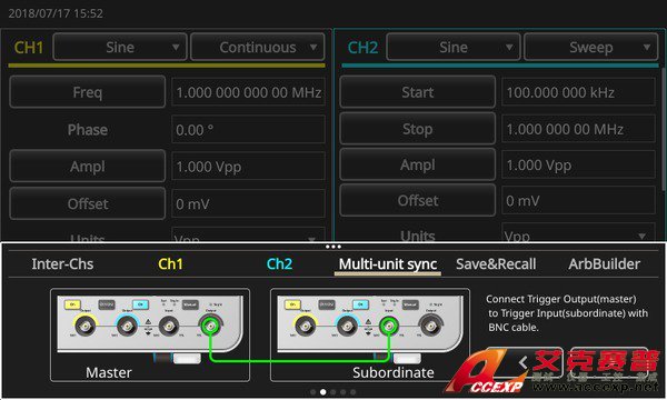 AFG31000 簡化了這個過程,它在屏幕上有一個向?qū)Чぞ?,可以引?dǎo)用戶完成電纜連接和設(shè)置配置,實現(xiàn)多臺發(fā)生器同步。